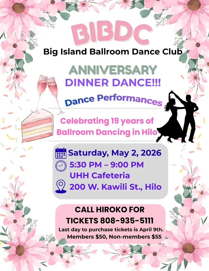 The club was founded in 2007, and is a non profit, tax exempt organization with bylaws. BIBDC offers a variety of dance classes and social dance events. From American smooth dances like the Waltz, Tango, and Foxtrot to lively styles such as Cha-Cha and East Coast Swing, the diverse curriculum covers it all. The club also organizes regular dance socials that provide members with opportunities to practice, socialize, and enjoy the vibrant ballroom dance community in Hilo.